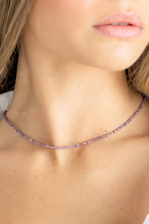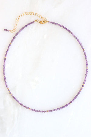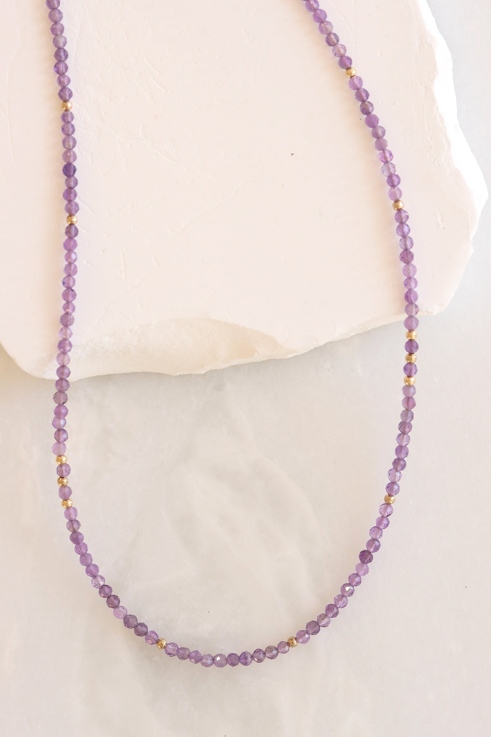 Faceted amethyst beads and gold accents offer a soothing wash of violet color. February’s birthstone, amethyst is believed to support clarity, intuition, and a calm, centered spirit.